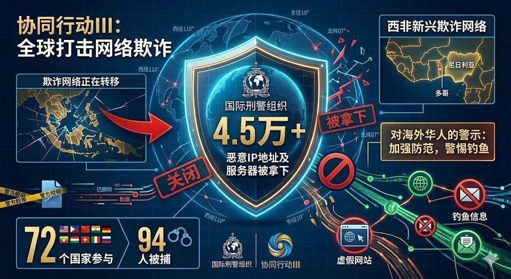 国际刑警组织(INTERPOL)近日正式披露了“协同行动III”(Operation Synergia III)的收网细节。这场横跨72个国家的跨国打击行动,再次撕开了全球电诈网络的黑幕。